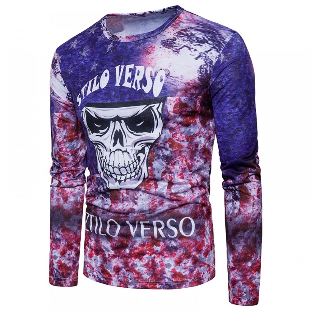 Fashion Men's Casual Long Sleeve Slim Skull Digital Print T-Shirt Hot Sale